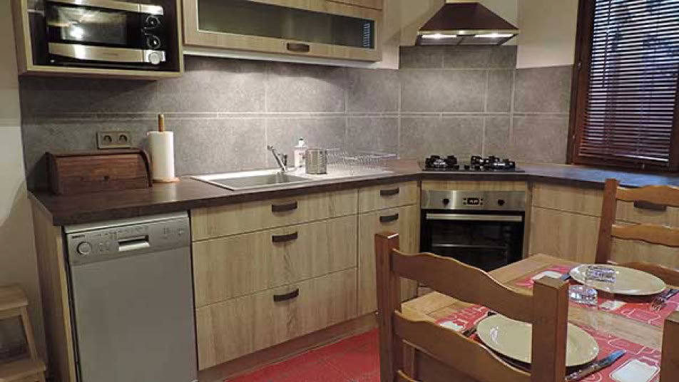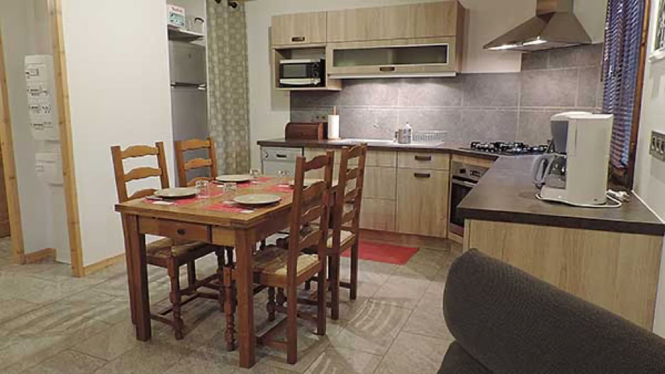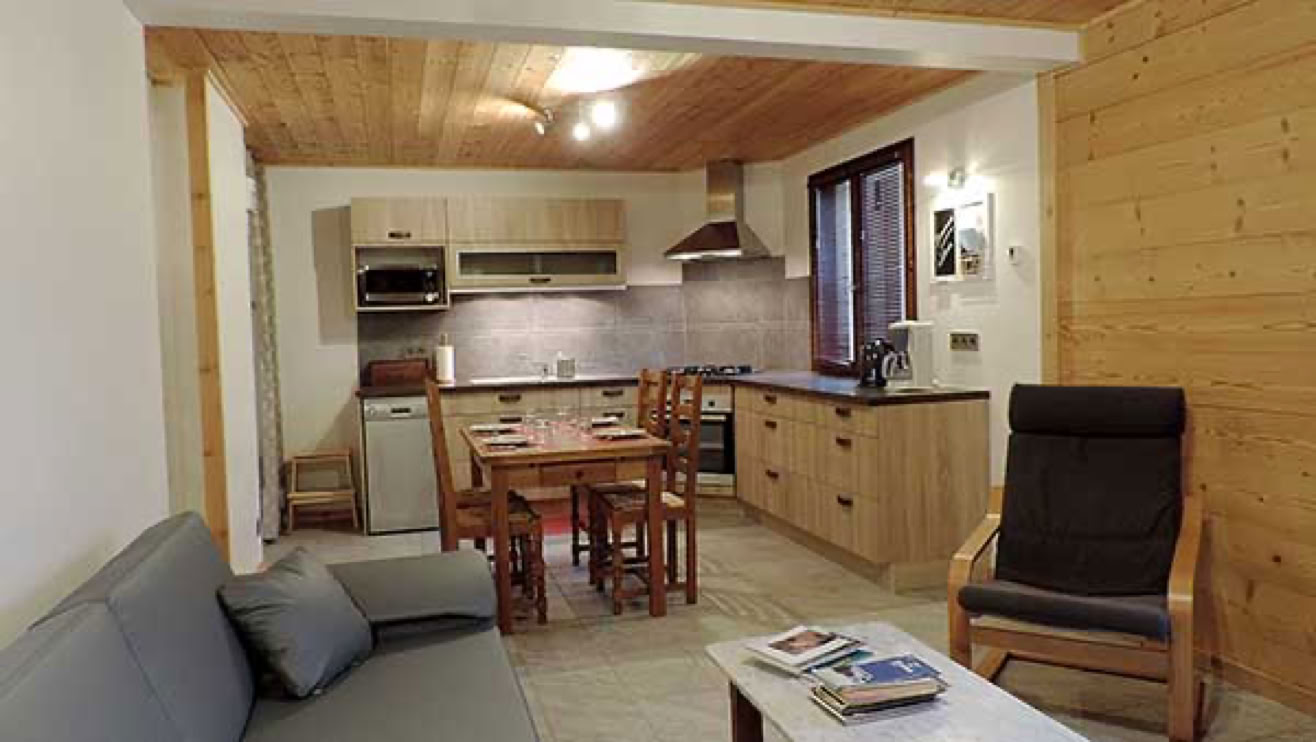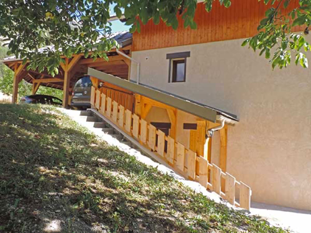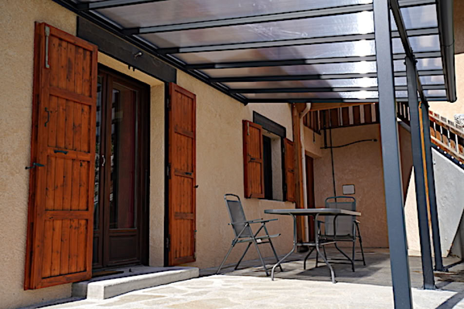 Une entrée indépendante donne accès à l’appartement de plain-pied. Elle est protégée par un auvent faisant aussi office d’abri skis, vélos, étendoir à linge et autres.