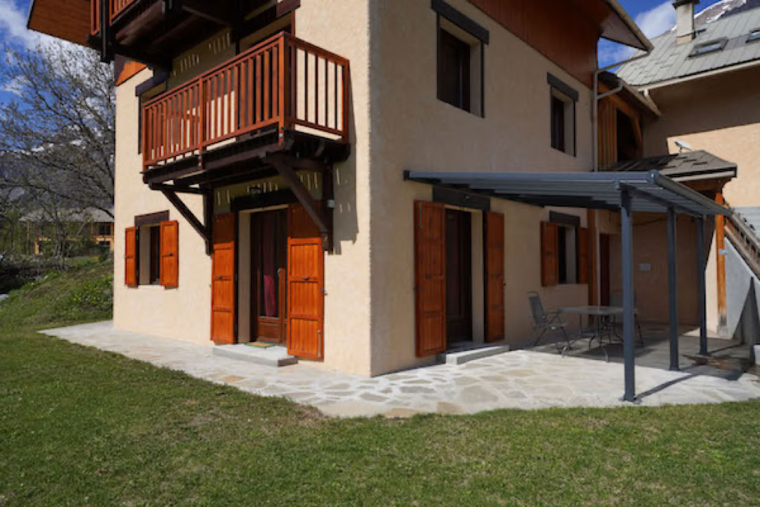 Une terrasse en lauzes, un parterre végétal, un coin barbecue pour apprécier encore plus votre séjour face aux montagnes et une pergola qui permet, l'été, de profiter de la terrasse par tout temps.