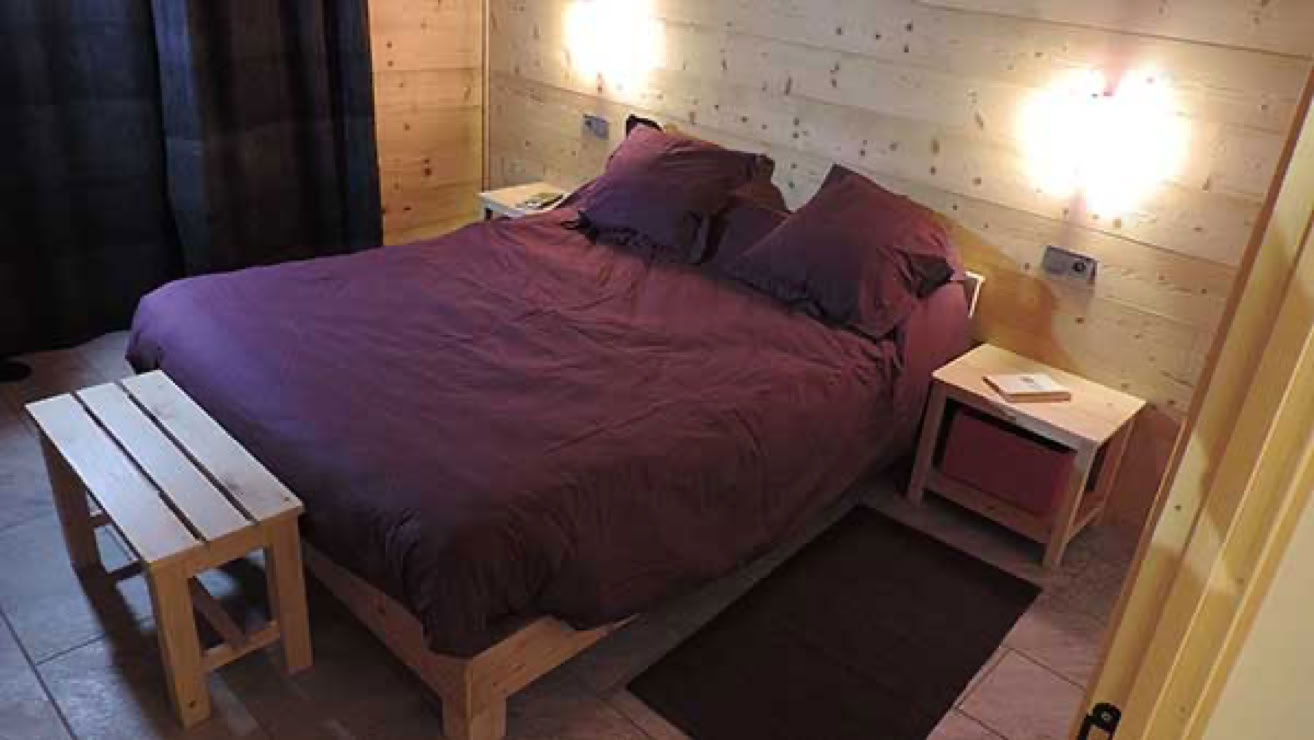 Dans un environnement boisé, la chambre est composée d’un lit de 160 par 200 cm d’un grand placard, d’un repose-valise, de tables de nuit, ...